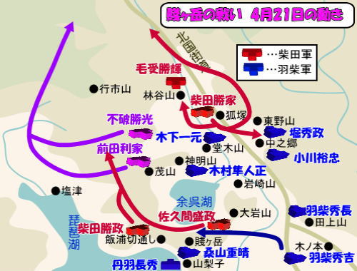 4月20日、秀吉方の丹羽長秀は琵琶湖を渡っていましたが、家臣の「待て」という意見を押しのけて進路を変更し、大将がいなくなって劣勢に立たされていた秀吉軍と合流し、盛政の軍の撃破に成功。